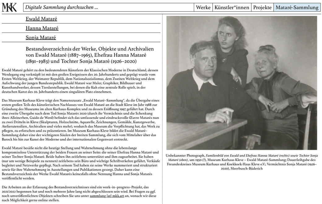 Onlinestellung des digitalen Bestandsverzeichnisses der Werke, Objekte und Archivalien von Ewald Mataré (1887–1965), Ehefrau Hanna Mataré (1891–1983) und Tochter Sonja Mataré (1926–2020)